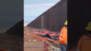 امریکی ریاست ایریزونا میں ایک تارکین وطن ڈونلڈ ٹرمپ کی گریٹ وال پر چڑھنے کا لمحہ, جبکہ اس کے بالکل ساتھ ہی اسے تعمیر کرنے والے کارکن ہیں۔.