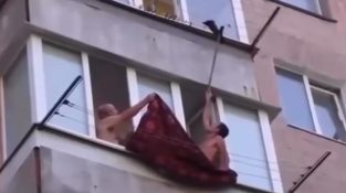دو افراد اپارٹمنٹ بلاک سے گرنے کے خطرے میں پائی جانے والی بلی کو بچانے کی کوشش کر رہے ہیں۔.