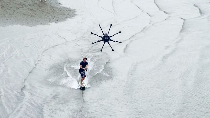 Freefly 公司提出了一個新的運動, dronesurfing. 視頻中的男子被 Freefly ALTA 8 無人機拉著在水中衝浪. 這架無人機有 8 個電機,總功率為 950 瓦. 僅需17.000 美元…