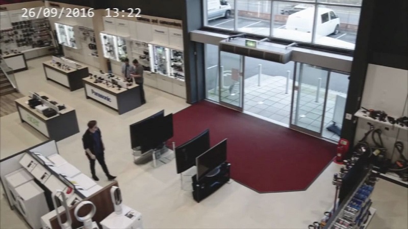 該名男子走在走廊上時,一種產品,引起了關注. 走近接近四個平板電視, 鞠躬,觀察其中之一. 但也有一些不太可能的方式,他把四個電視在地面. 總損失為5500€.