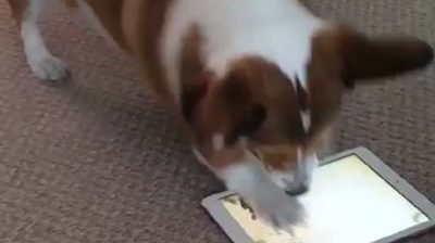 如何識別一個好的遊戲玩家; 她始終專注於一切的目標,發生了什麼. 在這裡,一個korgki品種的狗玩平板電腦, 但是奇瓦瓦來自他身後心懷不軌. 不受干擾的繼續korgki扮演若無其事.