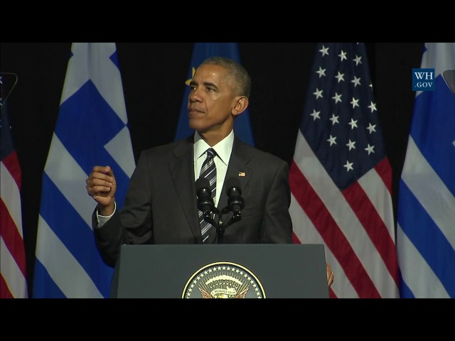 在斯塔夫羅斯尼亞爾霍斯文化中心在雅典美國奧巴馬總統的講話, 2016 年 11 月 16 日. 從白宮網頁視頻.