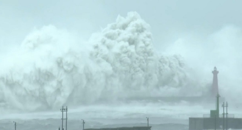 2016 年 9 月台灣颶風 Megi 過境期間擊中燈塔的巨浪集合.