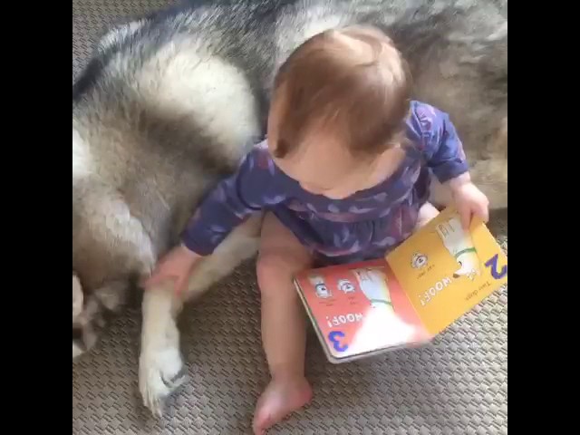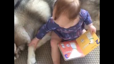 嬰兒一本書與動物浮型和喚醒一隻狗向他出示這本書裡面的那個圖片.