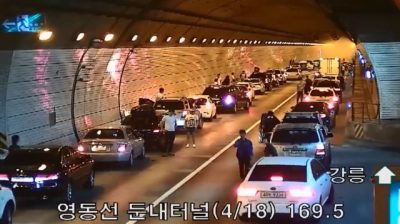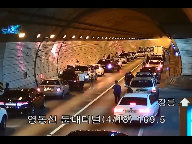 在韓國隧道發生事故後駕車合作. 這個場景發生在Dunnae隧道 (隧道) 國家Yeongdon街 (倭奴和江陵市之間). 駕駛人因交通事故被「困」在隧道內.