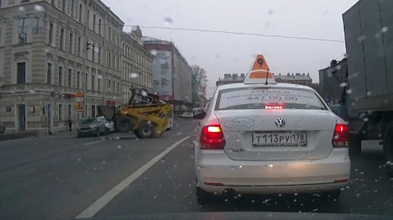 一名工人失去在靠近聖彼得堡的馬林斯基劇院一街的小型挖掘機的控制, 俄羅斯. 小型挖掘機開始反彈瘋狂提升鬥擊中一輛汽車前. 當工人終於設法固定車輛瘋狂圈地結束.