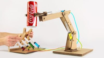 如何才能建立一個機械臂紙板, 這是作為一個遊戲相當有趣. 對於建設需要紙板, 8注射器, 一個舊電池, 4軟管, 小木, 膠水和…耐心.