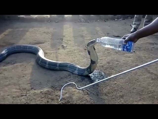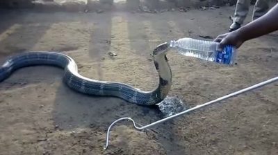 在印度南部Kaiga村, 一個人從一個瓶子幫助口渴的眼鏡王蛇給水. 印度南部受乾旱影響,這影響了當地的野生動物. 毒蛇長度3,6米, 找水,沒有運氣. 那位勇敢的人主動給眼鏡蛇水在他的右手一瓶和左鉤在每種情況下.