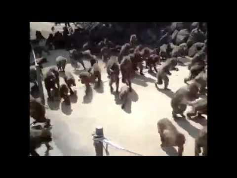 數百隻獼猴跑過泰國華富裡的一條路, 當 Prang Sam 猴廟燃放煙火...