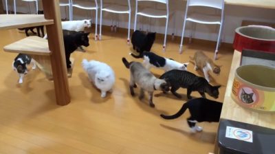 在日本福井與貓咖啡館的老闆買了清潔機器人. 貓會接近奇怪的物體以極大的好奇心, 但突然有動靜就嚇.