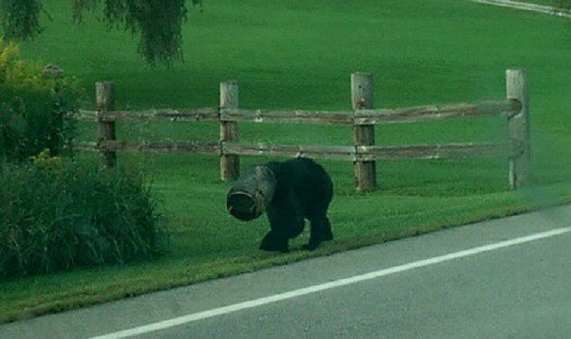 許多農民走上捕捉和釋放卡住了她的頭在一個塑料容器小熊. 這個場景發生在城市號角縣,賓夕法尼亞.