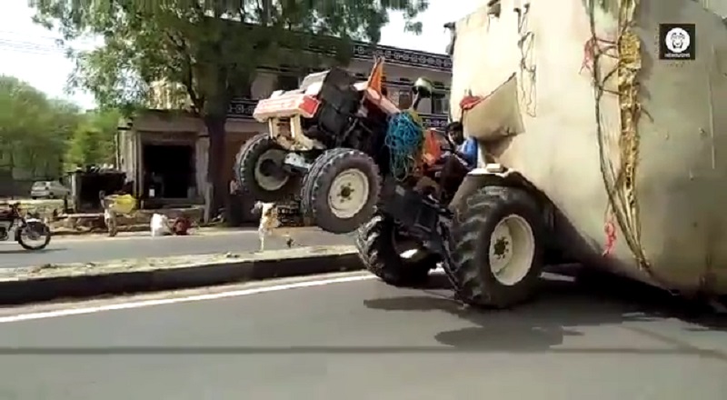 在印度拖拉機上升的兩個輪子, 因為體積很大的貨.