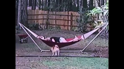 雖然老闆們的吊床上, 小獵犬試圖騙他們.