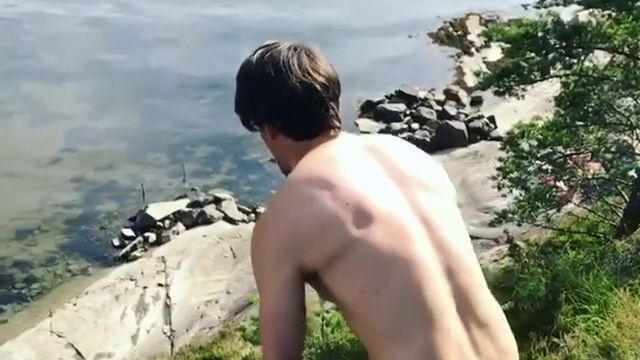 在挪威卑爾根, 本傑明樂趣從岩石上的幻燈片,然後海跳. 跳躍是相當危險的, 但幸運的是正確的目的.