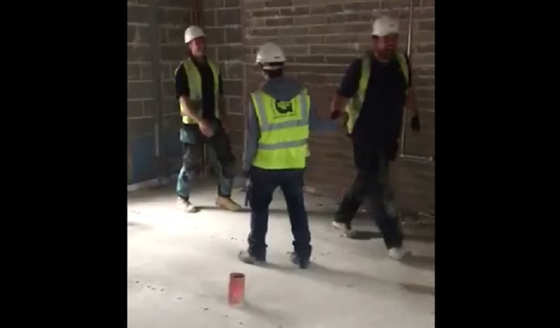 一名工人站在施工現場, 而沒有注意到推土機回來. 推土機操作員...