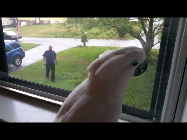 當他看到他的主人下班返回持久鸚鵡很興奮. 可以預見的時間回家, 坐在窗口前等待.