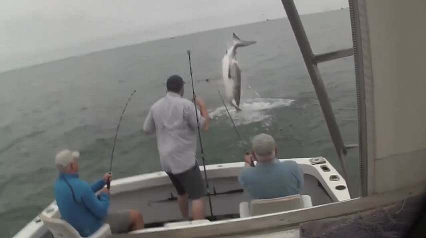在2017年8月12日在科德角灣,馬薩諸塞, 三名男子在一條船上釣魚. 其中之一實現已經引起了相當大的魚, 掏出. 雖然白鯊魚將大幅跳過水和搶贓物.
