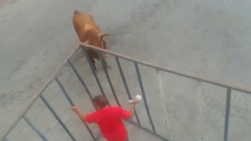 在城市ONTINYENT西班牙, 在籠子裡的男人喜歡和公牛打. 感覺安全, 該男子不斷地引起動物, 它便打破了欄杆和進入籠. 然後用他的角擊中該男子猛烈, 而旁觀者干預,設法營救他.