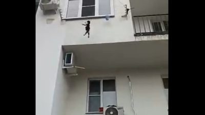 捉一隻貓,從視窗的布落人, 在一幢大廈二樓.