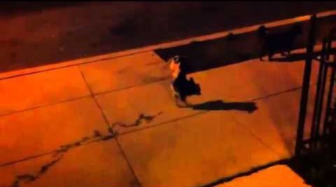 由於一些未知的原因, 這只狗爬倒下來房子的樓梯.