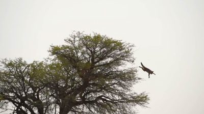 在卡拉哈迪Transfontier公園在非洲博茨瓦納, 在樹Karakalou和非洲野貓之間的旅遊記錄追. 卡拉卡拉有陷阱在一棵大樹的野貓, 但後者將在地面一個大的跳躍逃跑.