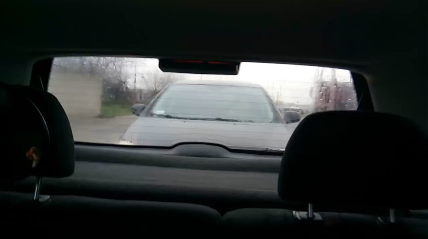 一車的水噴灑器有一個小病變, 和水向後飛. 駕駛員記錄的滑稽的一幕在他的手機.
