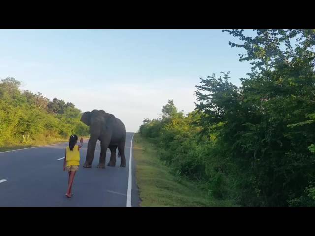 近Kataragkama斯里蘭卡公路2016年6月8日, 野生大象朝一群人走. 一個小女孩開口了撫養她的手. 動物初次停止, 然後喜歡離開並返回森林.