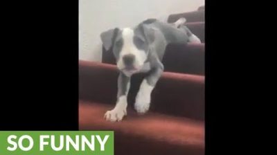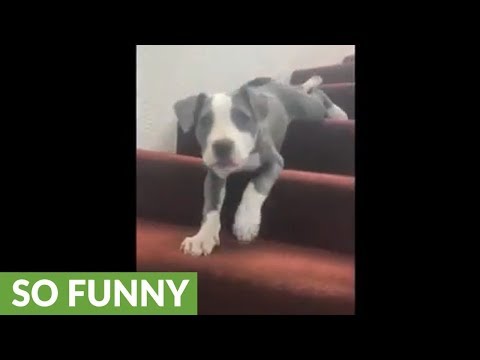 關注命名特卡特這個可愛的小狗肚子上滑下旋梯. 無價!