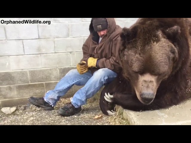 在野生動物保護區野生動物孤立中心在紐約Ostvil, 照顧者吉姆Kowalczik安慰金皮, 一個巨大的科迪亞克熊重達635公斤, 這似乎有一個艱辛而漫長的一天.