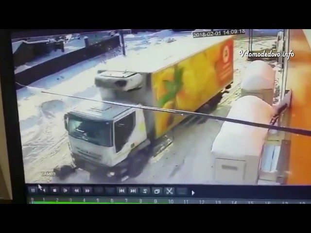 2018年2月1日在俄羅斯多莫傑多沃地區, 卡車司機不檢查盲點,幾乎致命的打擊祖母, 終於管理從車輪逃生.