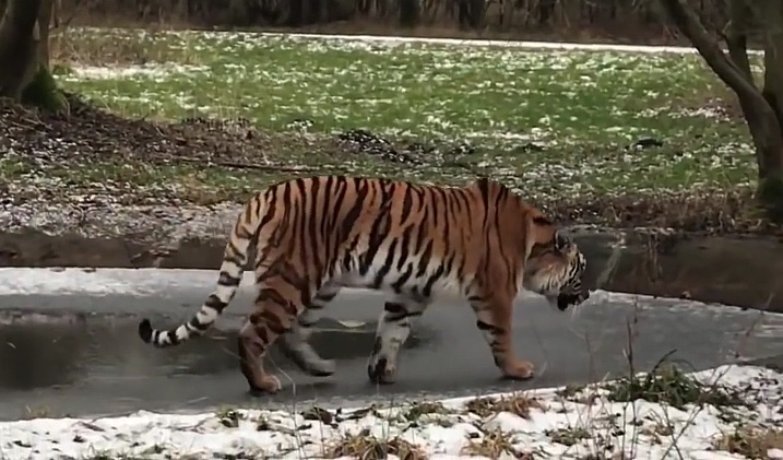 老虎走在冰凍的湖面, 並把她嚇壞了腳下的冰破裂時,突然.
