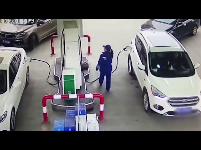 在中國A女司機其剛剛拿到畢業文憑, 在一個填充站被破壞的燃料泵, 當他試圖離開與噴嘴仍然附著在車.