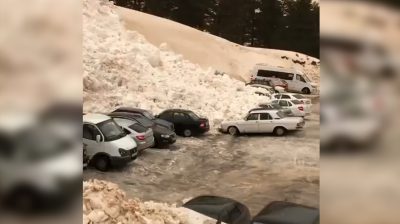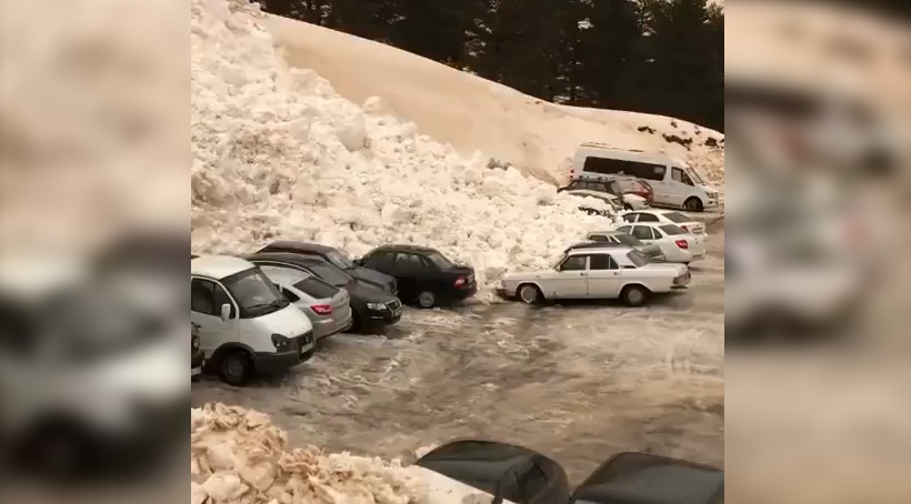 一場巨大的雪崩席捲而來,超過12輛汽車被埋在雪下, 在厄爾布魯士山在俄羅斯滑雪勝地. 所幸沒有人受傷,並在一段時間後停止雪崩不會傷害植物.