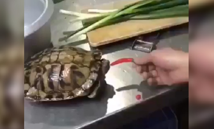 影片集合裡的人幫海龜, 把黏在殼上的生蠔清洗乾淨...