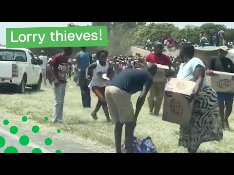 盜賊用一堆箱子滿洗衣粉的起飛一輛貨車後,在南非的道路上翻車.