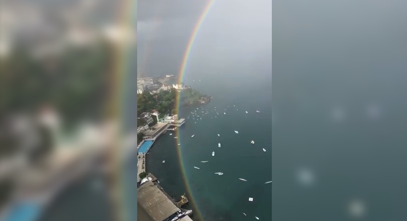 從摩天大樓的城市薩爾瓦多,巴西的窗口, 有人拍攝一部難得的圓形彩虹.