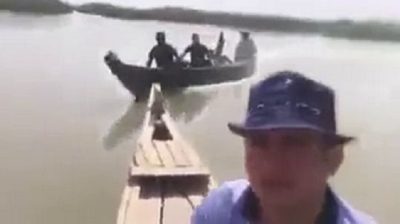 連同他的機動獨木舟朋友在伊拉克的沼澤, 一個人拉扯自己的視頻時,他們的船與另一傳遞獨木舟碰撞. 衝突是激烈的,對雙方船隻乘客落入水中.