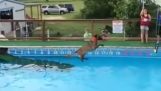 令人驚訝的跳躍,從字面上飛釣對象在池塘狗.