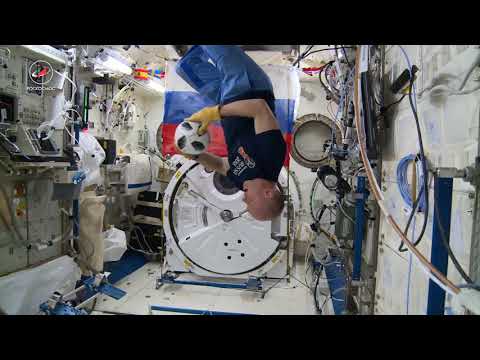 宇航員ROSKOSMOSA安東·謝卡普爾羅維和奧列格·阿爾捷米耶夫在國際空間站上進行足球訓練.