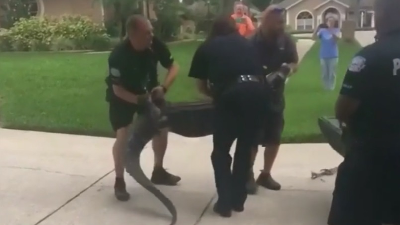在奧科伊,佛羅里達州, 捕手試圖運輸鱷魚 2,5米他們剛剛抓到, 誰流浪到附近. 當他們把他放到一個麵包車後面, 鱷魚會給兩個硬打擊頭部和尾部, 留下一個無意識的捕獸.