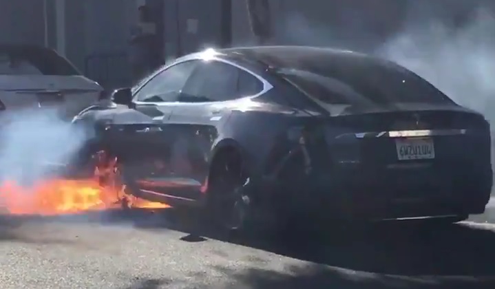 在2018年6月16日在聖莫尼卡大道加州, 司機用特斯拉型號3移動時,突然下起了出來車輛底盤下方的火焰. 附近的導遊告訴他發生了什麼, 他停下來,立即跑到車外. 這乍看起來, 汽車電池被刺穿, 而造成點火.