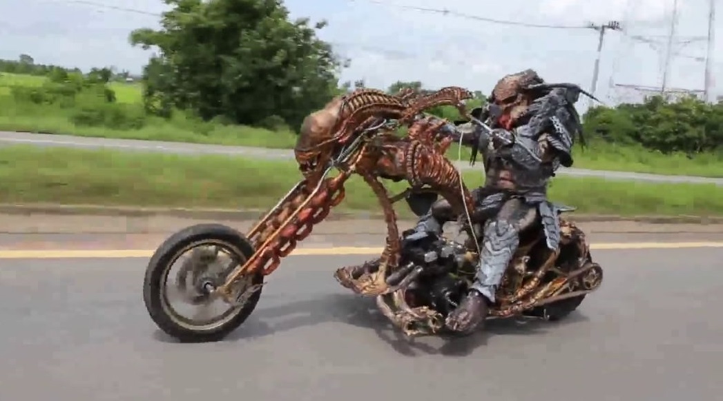 Ο捕食者, 從同名電影中著名的人物,外星人, 6 月 15 日,在泰國春蓬附近的一條道路上發現了一輛奇怪的摩托車. 捕食者的偽裝騎手導致一個非常合適的菜刀.