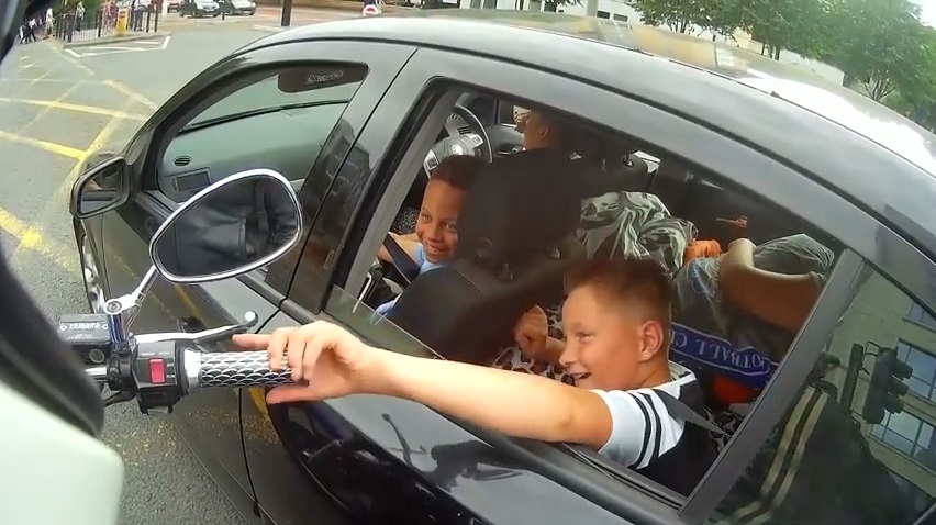 一名電單車司機遇到兩個年幼的孩子在車內, 和葉打開油門,發動機.