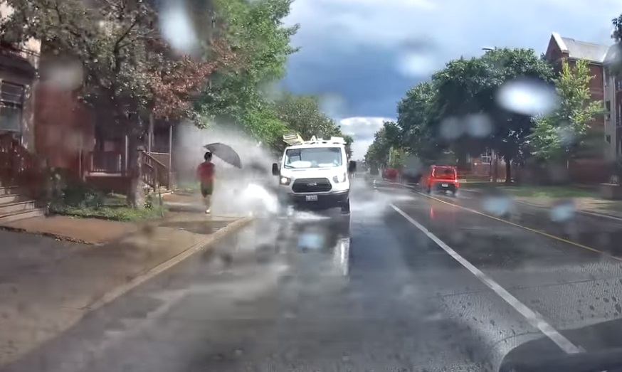 在2018年7月27日在加拿大渥太華, 有人記錄了貨車司機, 從雨水坑行人故意傳遞.