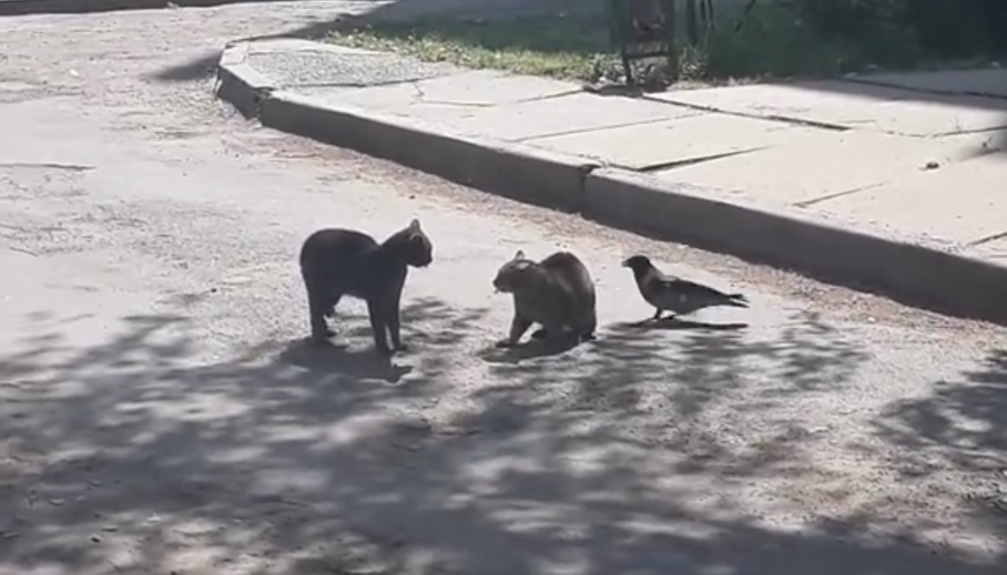 烏鴉試圖清除兩隻貓在索利戈爾斯克白俄羅斯附近戰鬥. 雖然貓在道路中間面對面, 烏鴉試圖掐自己的尾巴.