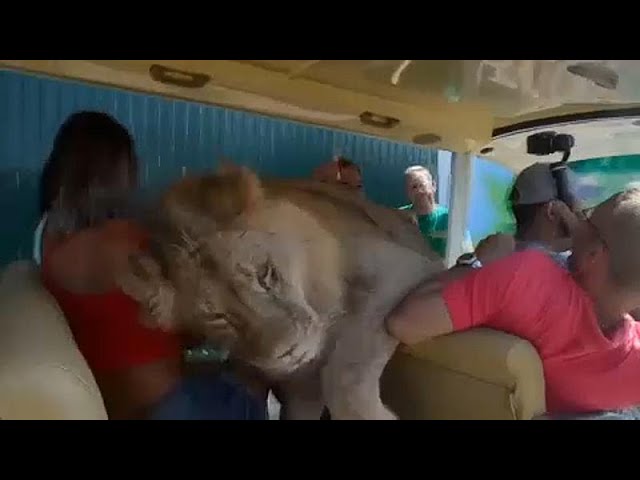 在野生動物園維爾諾赫斯克克里米亞, 一隻馴服的獅子跳進車裡,遊客要求一些…撫摸.