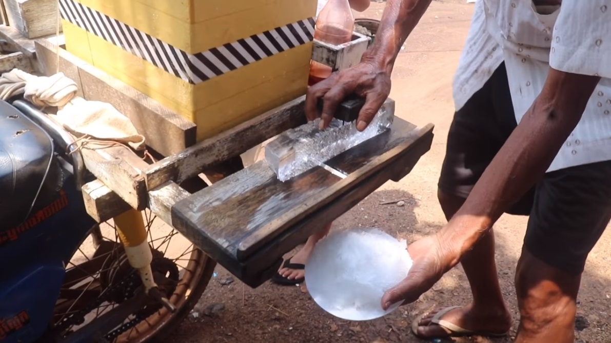 在柬埔寨兒童耐心地等待他們的冰淇淋從街道pagotatzi, 誰擦冰,並形成各種形狀. 然後在冰澆漿和冰淇淋準備. 但看起來不太健康...