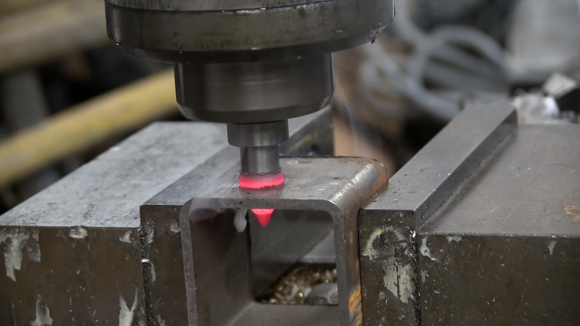 摩擦用演習來建立強大的聯繫, 因為它不會刪除從洞裡的金屬, 但熔體,並創建孔周圍強大的牆. 所以, 螺釘可以在金屬和鏈接多個彎曲被捕獲成為更強. 由碳化鎢製成的摩擦鑽頭, 一種比鋼強 3 倍的材料. 這裡我們海恩顯示摩擦是如何工作的鑽.