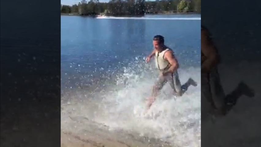 在澳大利亞一個人來到一個池塘的銀行,因為它與衝浪其軀表面上.