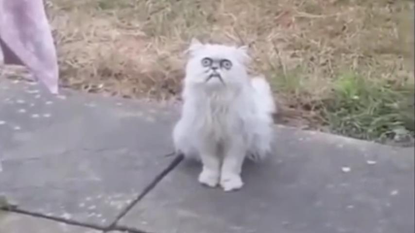 有一個非常奇怪和可怕的臉貓, 出現在一所房子的庭院前.